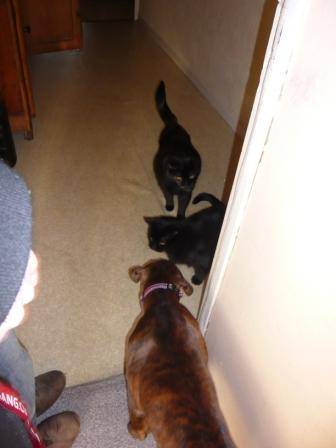 Les minous ont eu l'air de se dire que c'etait bizarre : ça ressemble bien à Ares mais c'est plus petit et pas de la même couleur... par contre c'est tout autant baveux! Bref, ils ont eu droit chacun à leur méga léchouille. Réglisse a eu quand même une petite frayeur quand Charline lui a courru après : il avait perdu l'habitude!